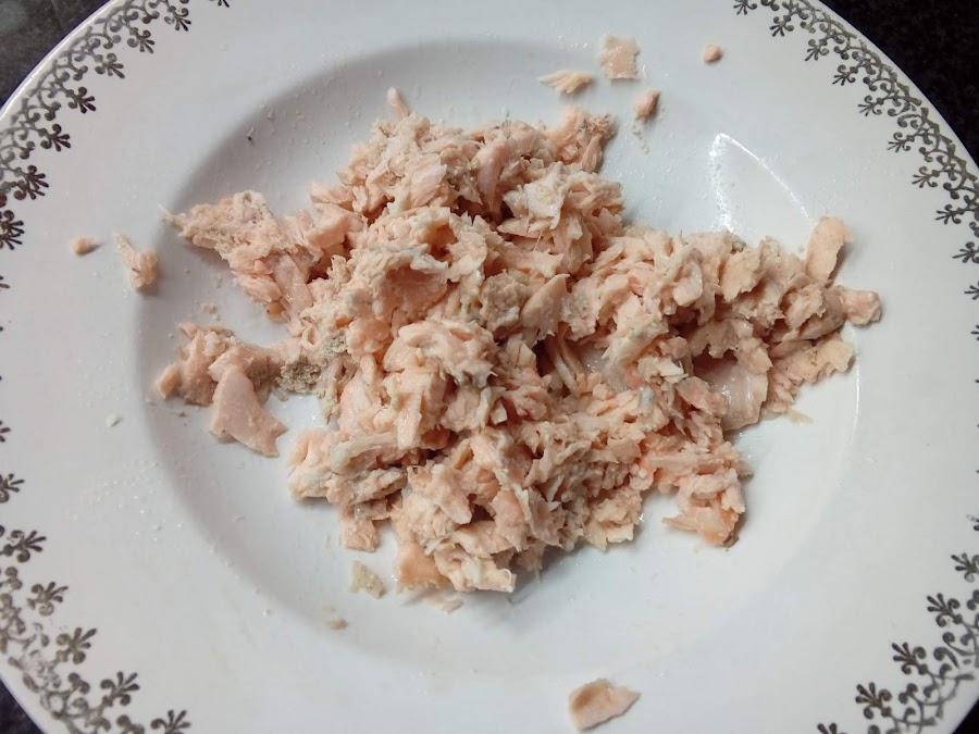 Cocemos la cabeza y la espina del salmón 1o minutos en una olla con agua y sal, dejamos enfriar y rescatamos toda la carne posible sin espinas.