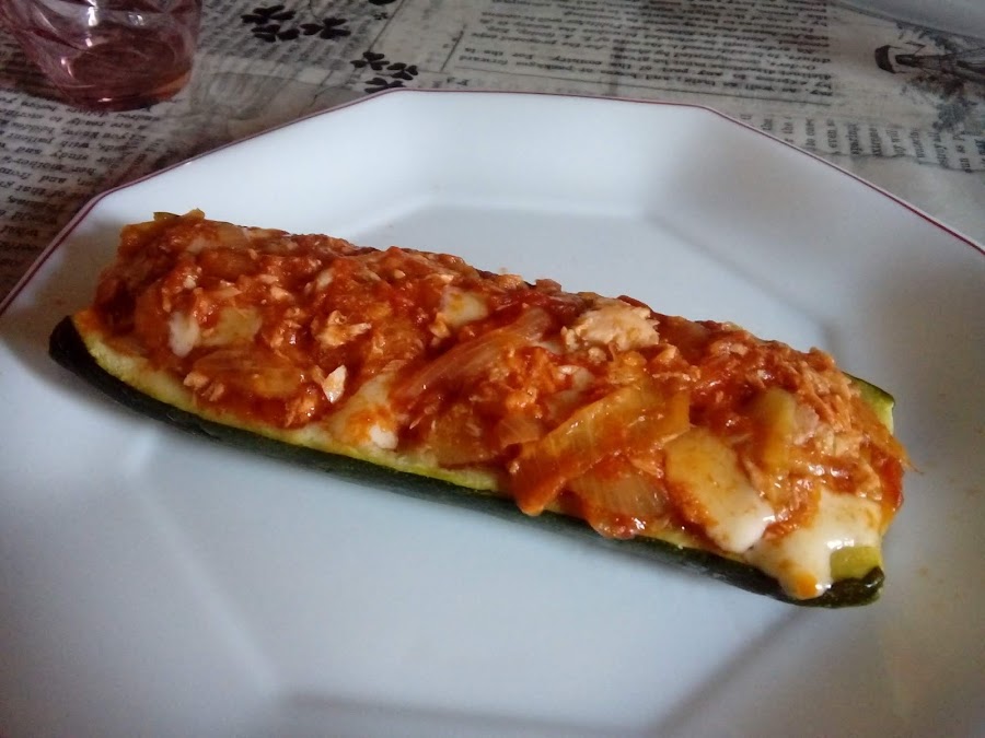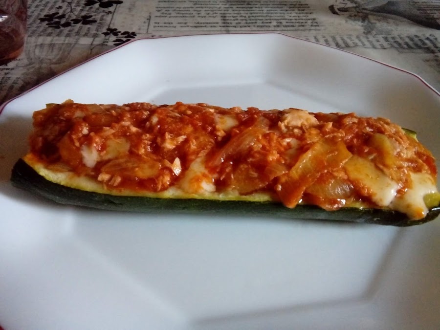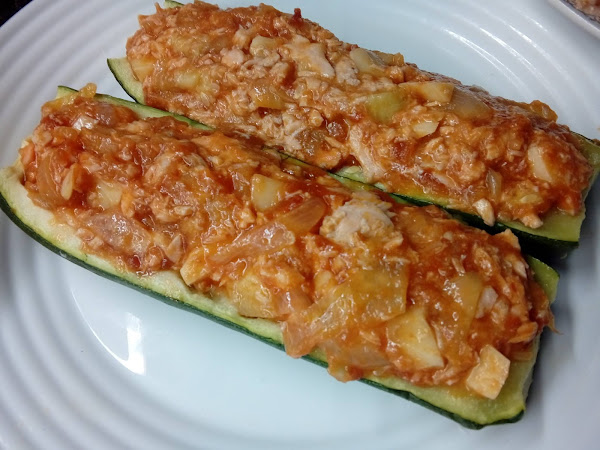 Partimos el calabacín a lo largo y le hacemos unos cortes para vaciarlos más fácilmente una vez cocidos. Le ponemos un hilo de acite y una pizca de sal. Los metemos en el microondas 10 minutos.