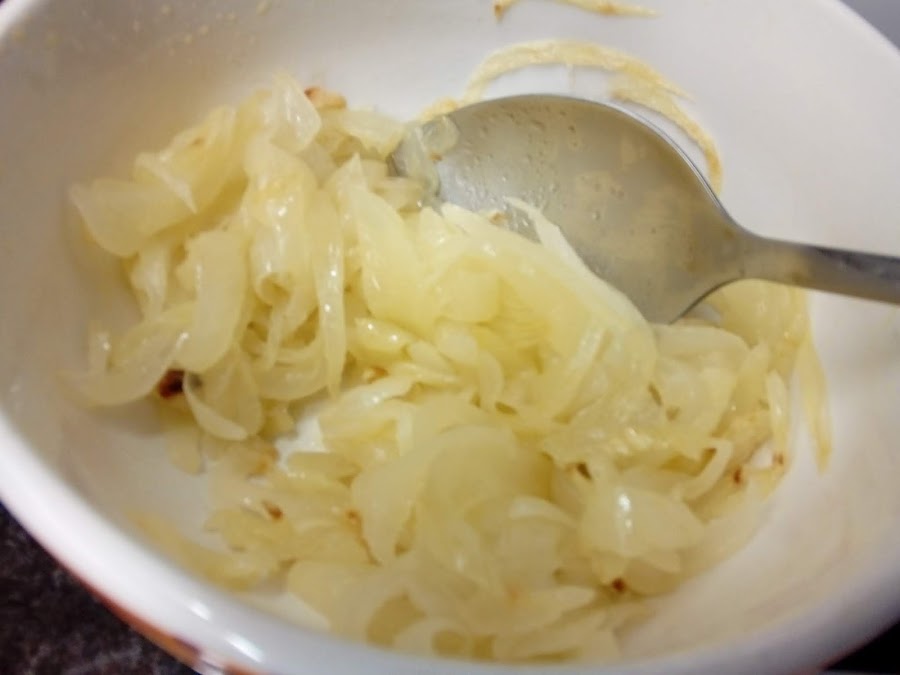 Picamos la cebolla en juliana y agregamos sal y aceite. Cocemos 10 minutos en el microondas removiendo a mitad de cocción.