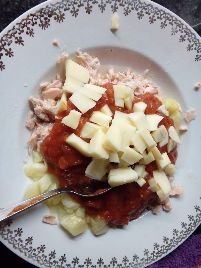 Añadimos al salmón, el tomate frito y el queso.