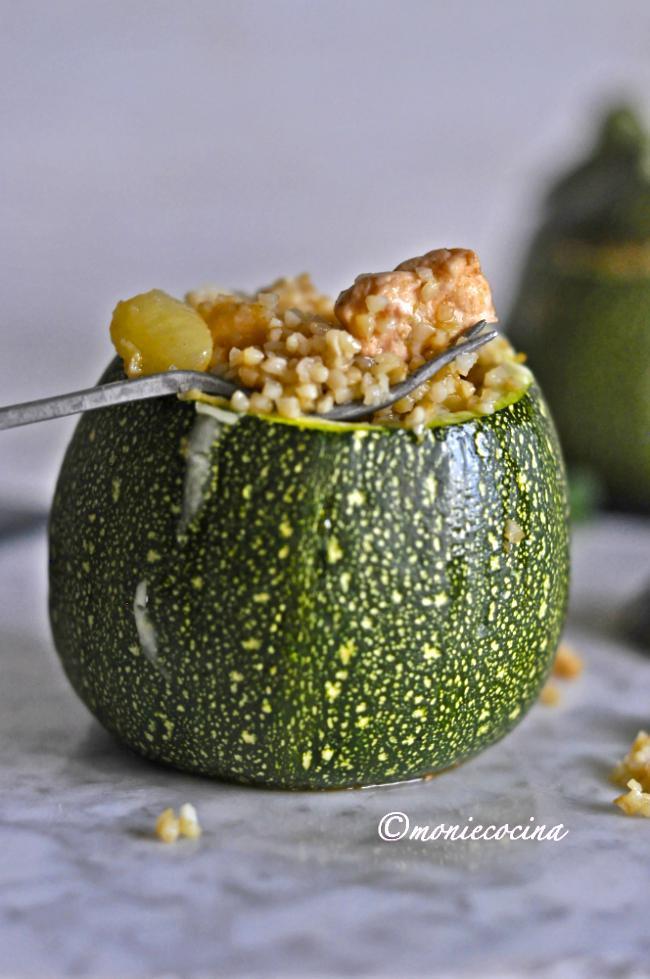 Comenzamos preparando el trigo bulgur, se prepara una parte de trigo por dos de agua. Se puede cocer, pero a mi no me gusta que se haga demasiado, porque luego irá al horno. Por lo que cuezo el agua, y lo añado al trigo en un bol y lo dejo tapado con un paño unos minutos mientras preparamos los calabacines.