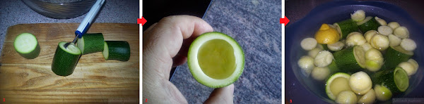Comenzaremos por cortar los calabacínes en cilindros pequeños y sacarles la carne con cuidado con un sacabocados para obtener unos "vasitos" pequeños de calabacín cuyo interior rellenaremos con la farsa.