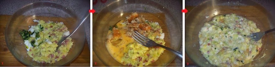 Cuando esté el calabacín listo, juntamos en el bol donde teníamos la miga a remojar el contenido de la sartén, el picatoste, lo del mortero y tres huevos batidos y mezclamos bien. Salpimentamos y mezclamos bien.