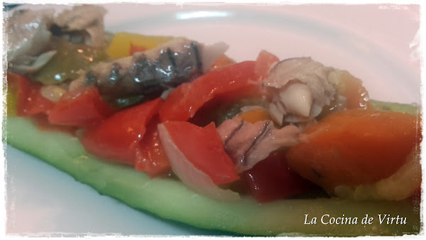 Vaciamos con cuidado los calabacines. En un recipiente apto microondas ponemos la pulpa de los calabacines, las verduras troceadas, aceite y sal y salteamos 6 minutos 800w