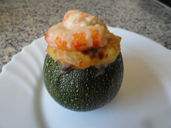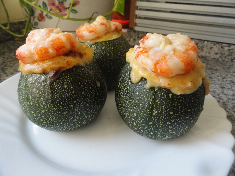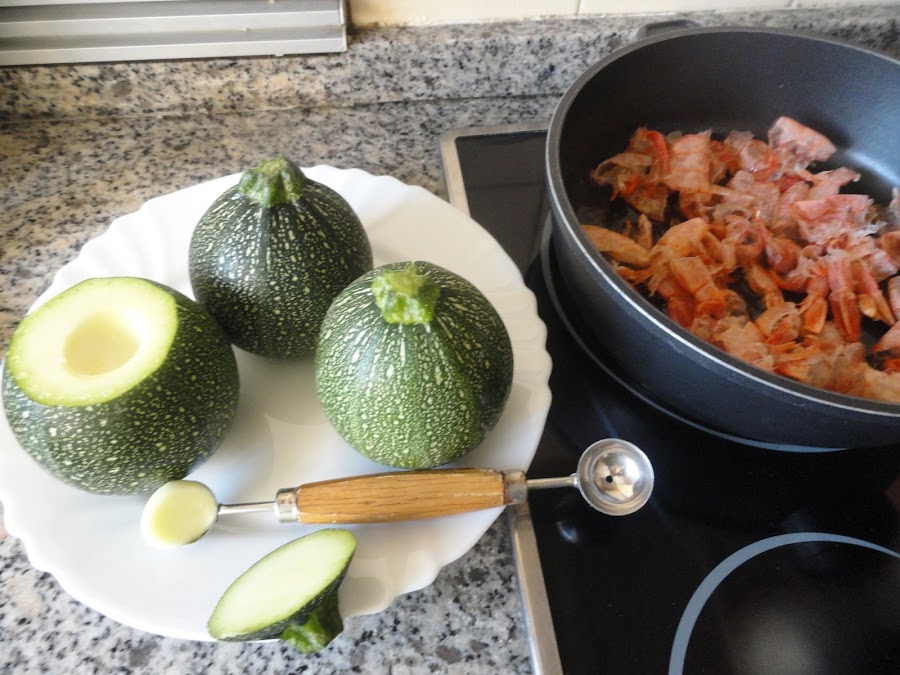 desechamos, y en ese aceite aromatizado con el marisco ponemos la cebolla en brumoise y el puerro, cuando esté bien dorado incorporamos los trozos de calabacín que hemos vaciado previamente, damos unas vueltas, que se cocine el calabacín, e incorporamos las gambas o en mi caso los gambones troceados (excepto seis que he dejado enteros para colocarlos de tapa), salpimentamos y dejamos que se hagan los gambones. En un rinconcito de la sartén ponemos un poco de aceite y cuando se caliente doramos la harina, para que no sepa a crudo. Ya tostada la harina mezclamos todo y ponemos la leche, damos vueltas, vueltas, que se forme una bechamel espesita. Dejamos templar para no quemarnos y rellenamos los calabacines. Ponemos al horno previamente calentado a 180º unos 20-25 minutos. Unos cinco minutos antes de terminar ponemos los gambones o gambas enteros encima y con un poco de queso parmesano rallado.