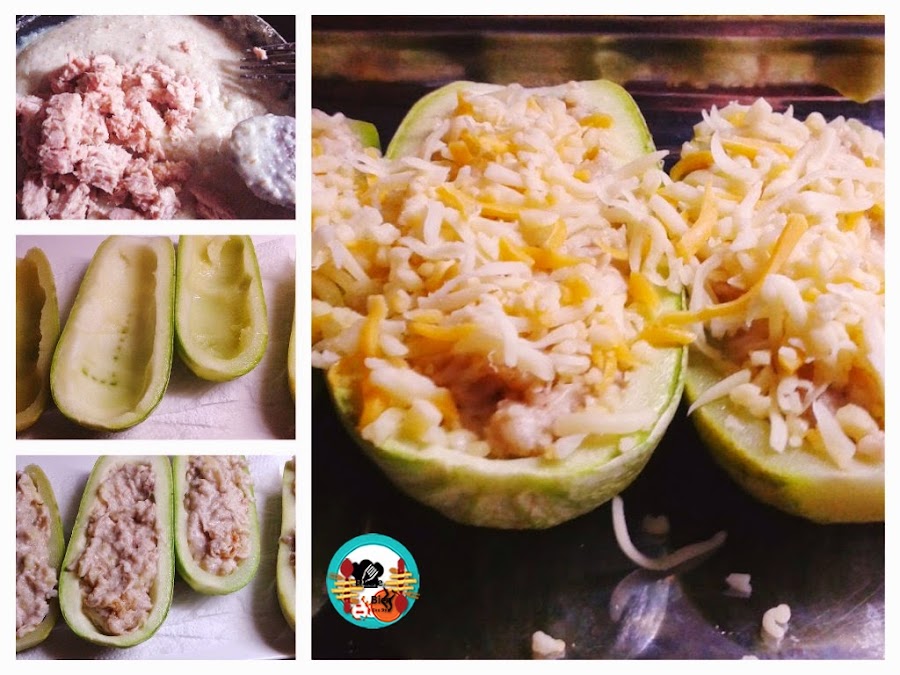 1.- Lavamos los calabacinos, los partimos por la mitad y los vaciamos. En una olla los cocemos con agua hirviendo y sal, 15 minutos. Los escurrimos bien y reservamos.