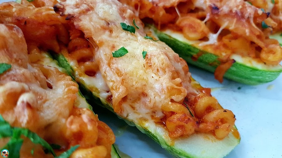 3.- Ponemos a cocer la pasta en agua hirviendo con sal y una hoja de laurel, durante 12 minutos o siguiendo las instrucciones del fabricante. Una vez estén aldentes las escurrimos bien. Mezclamos los macarrones con la salsa de tomate y atún. Con una cuchara vaciamos los calabacinos sin romperlos, rellenamos cada calabacino con los macarrones en salsa de atún. Cubrimos las verduras con queso de gratinar, gratinamos los calabacinos rellenos de macarrones 10 minutos en el horno hasta que el queso esté bien derretido (con el horno precalentado a 180º). Servimos con un poco de perejil fresco picado por encima.