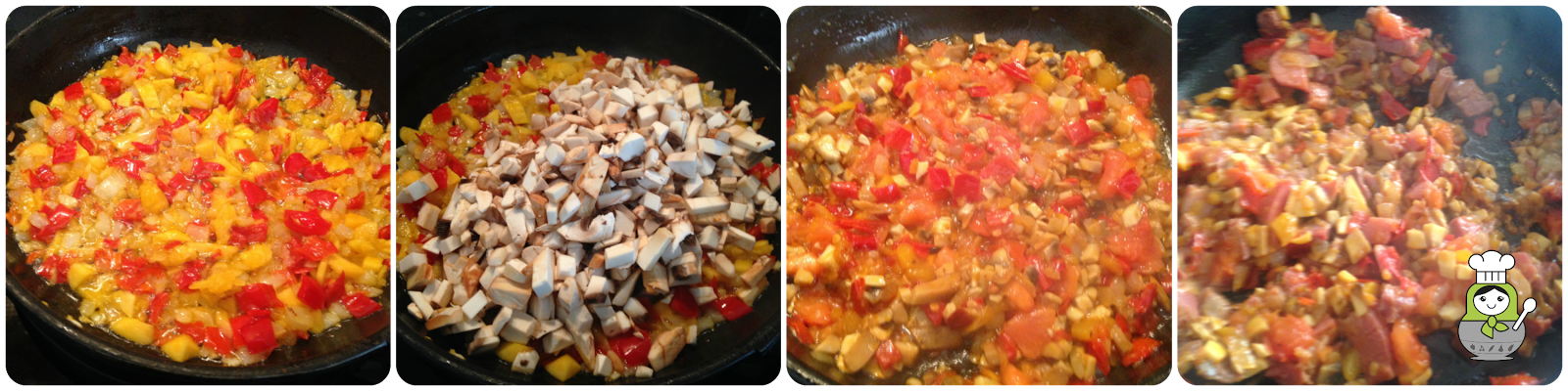 Eliminamos las pepitas de la carne de calabaza que hemos vaciado y la picamos bien en brunoise. Picamos por otro lado la cebolla, el ajo, el pimiento, el tomate y los champiñones. En una sartén con un chorro generoso de aceite de oliva, sofreímos el ajo y la cebolla a fuego suave. Cuando la cebolla esté algo pochadita añadimos el pimiento y unos minutos más tarde la calabaza. Por último, agregamos los champiñones y cuando esté bien hecho todo el tomate picado y los taquitos de jamón serrano. Rectificamos de sal y reservamos.