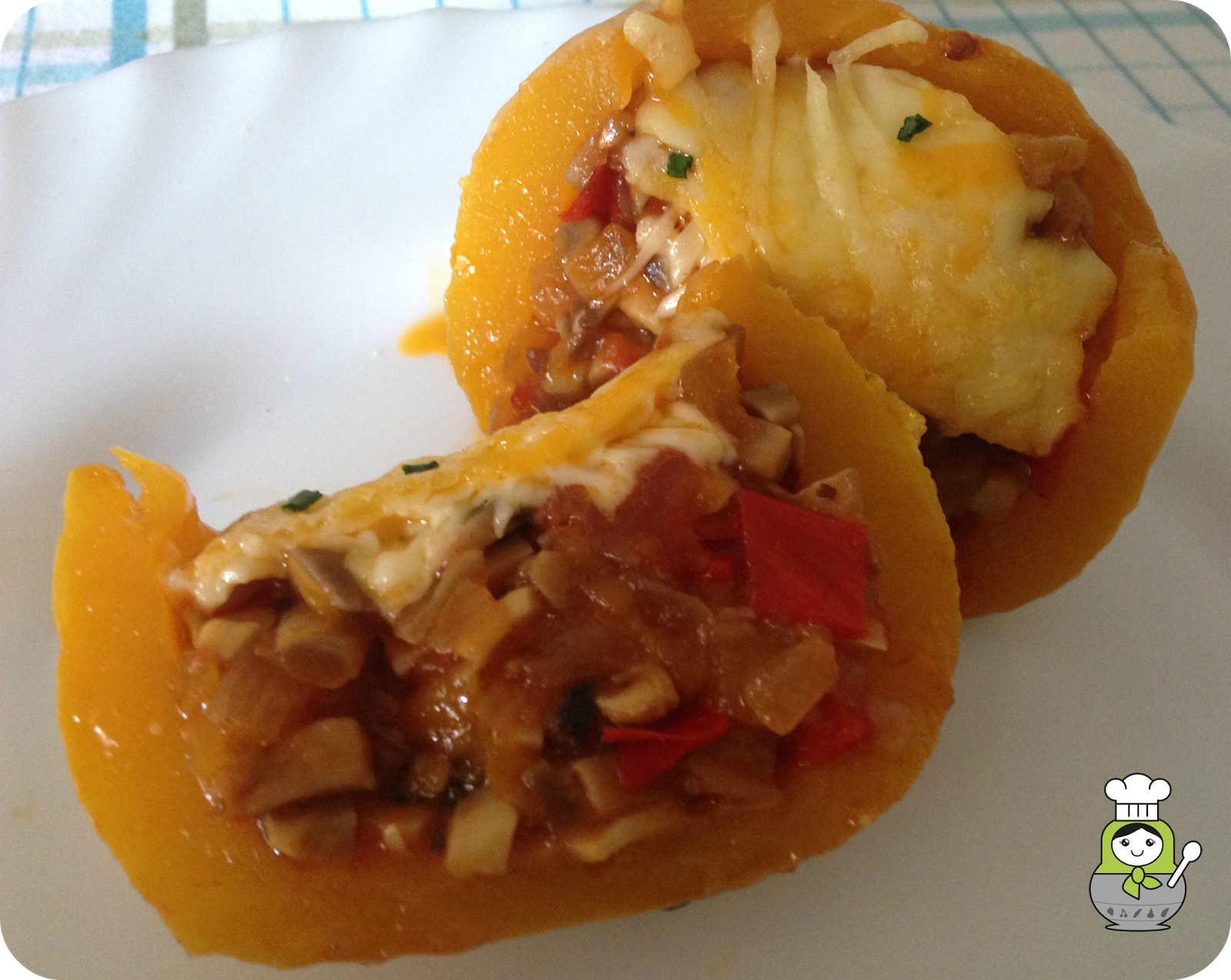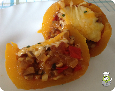 Rellenamos cada calabaza con el salteado de verduras y jamón serrano que hemos preparado hasta que quede bien cubierta y por último espolvoreamos la parte superior con queso rallado. Colocamos las calabazas en una fuente para horno junto con las tapas que hemos cortado y gratinamos. ¡Y listas para comer!