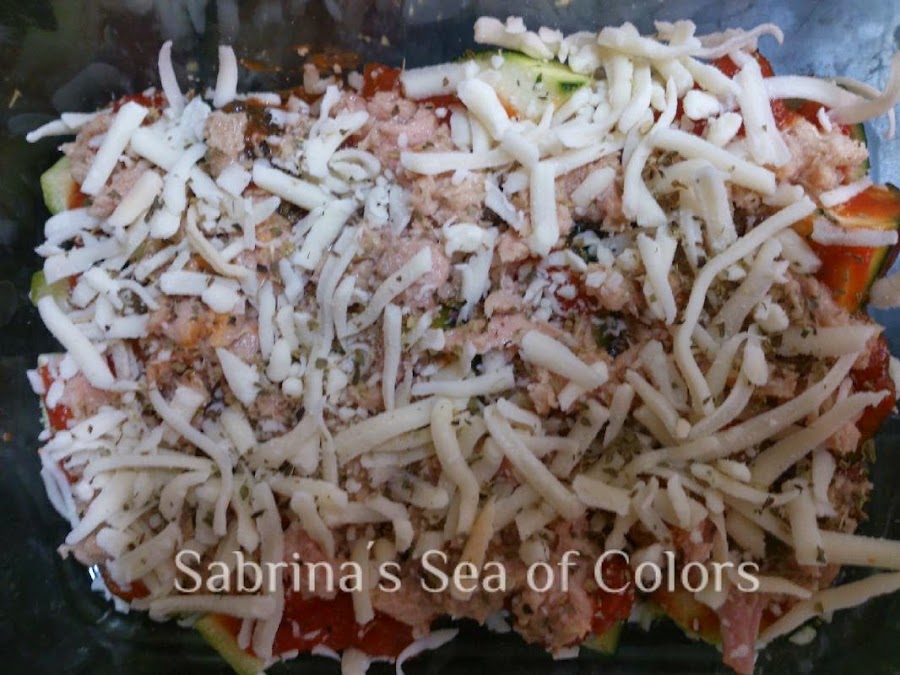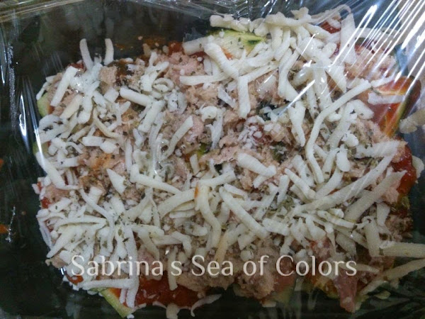 Cortamos los calabacines en rodajas y los colocamos en un pyrex o recipiente apto para microondas. Añadimos el tomate frito por encima. Si quieres un toque de aceite de oliva también.