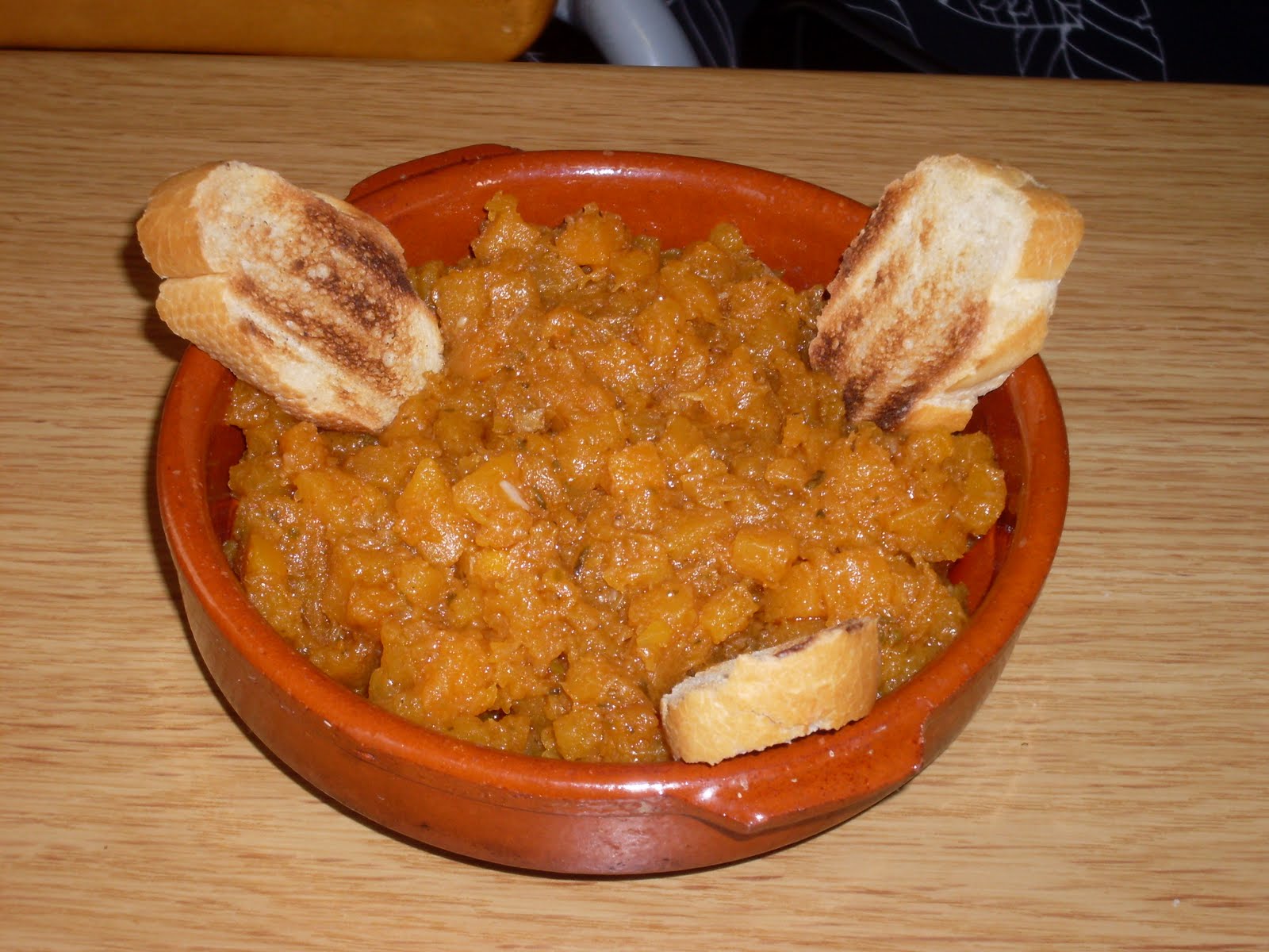 Añadimos a la picada un vasito de agua(debe quedar una pasta espesa) . Se le añade a la calabaza y se cuece a fuego lento, aproximadamente 15 minutos, o hasta que la calabaza esté blanda.
