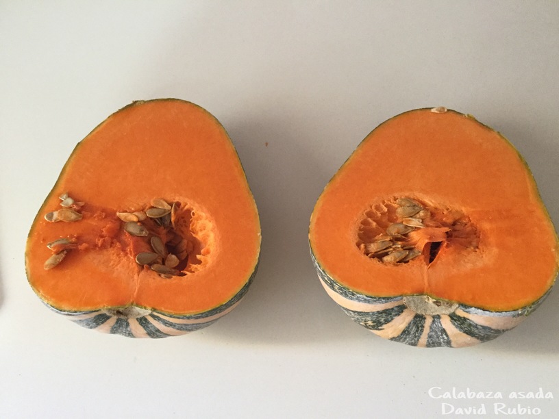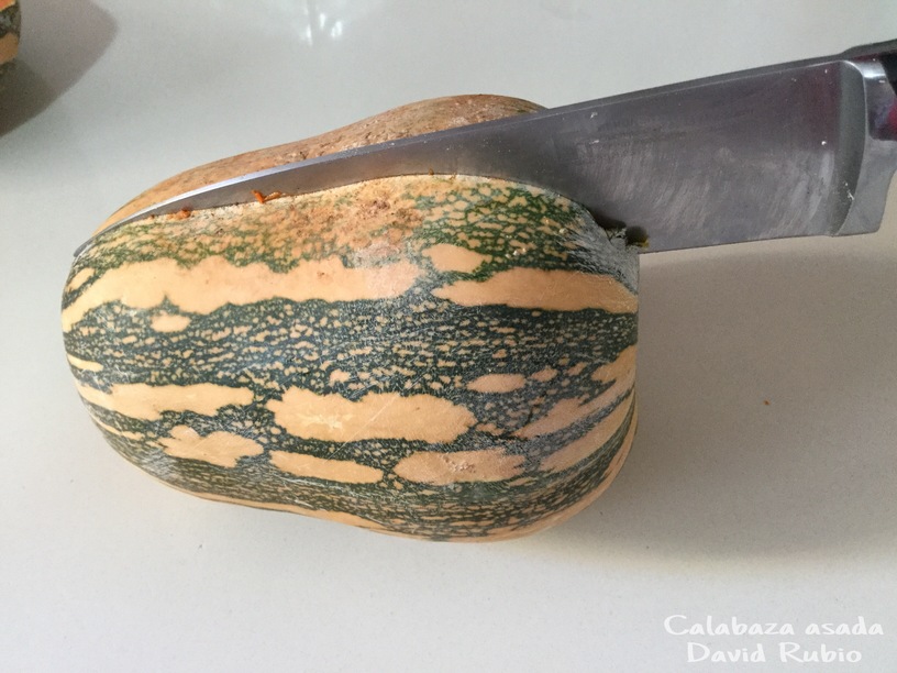 Con ayuda de un cuchillo cortaremos la calabaza por la mitad a lo largo.
