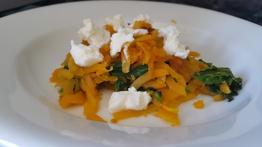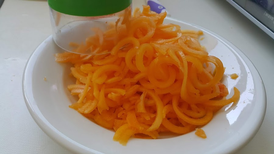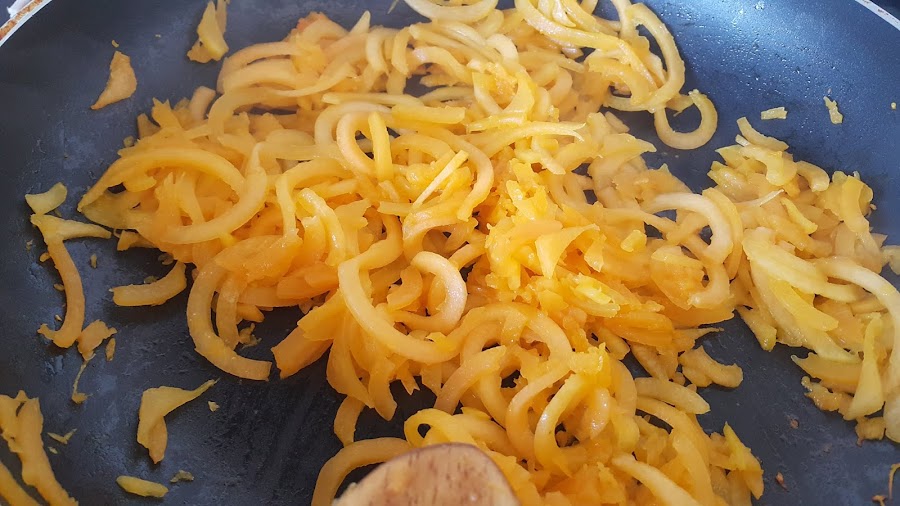 Empezaremos cortando la calabaza. Con la ayuda de un espiralizador de verdura hacemos fideos de calabaza.