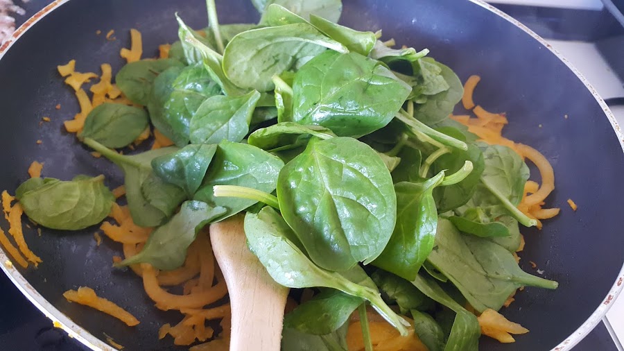 En ese momento añadimos dos puñados de espinacas y saltemos durante un par de minutos.