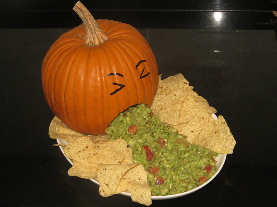 Colocamos el guacamole como si saliera de la boca de la calabaza, para que parezca que está vomitando y colocamos a los lados nuestros nachos.