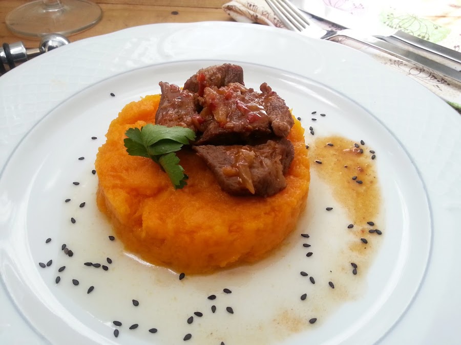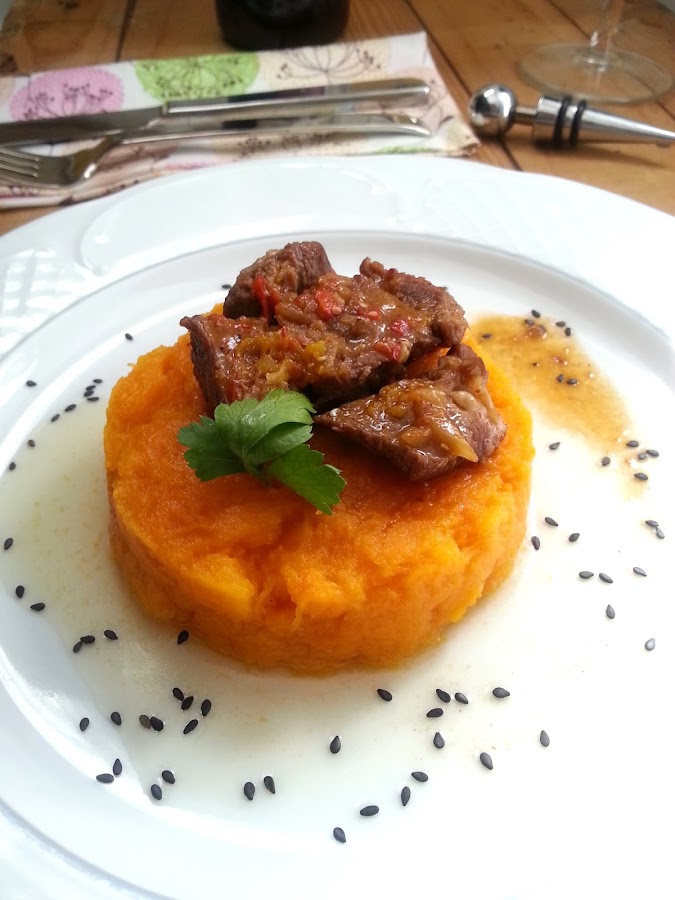 Pasado el tiempo de cocción de la carne, estará con abundante salsa, volcamos la calabaza sobre esta y que se impregne con la salsa de la carne. Reservar unos minutos antes de servir caliente, adornando con las semillas de sésamo.