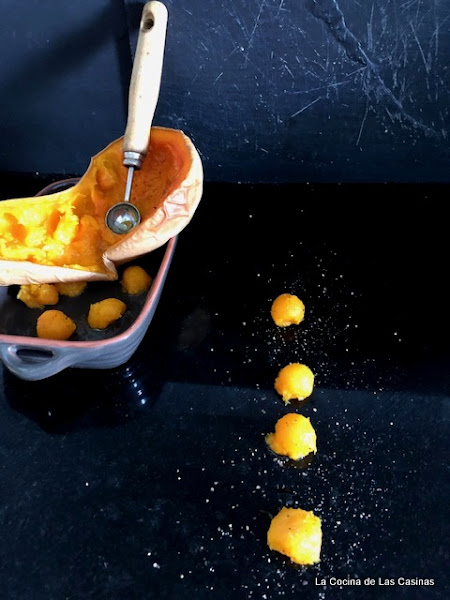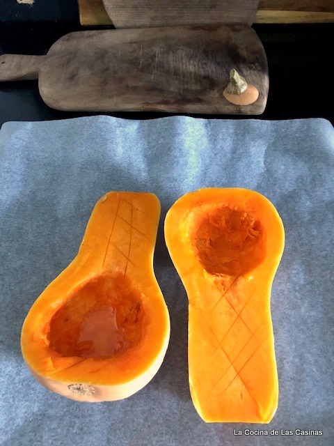 Lava la calabaza, corta en dos mitades y extrae las pepitas. Haz unos cortes con el cuchillo en sentido trasversal sin llegar a la piel.