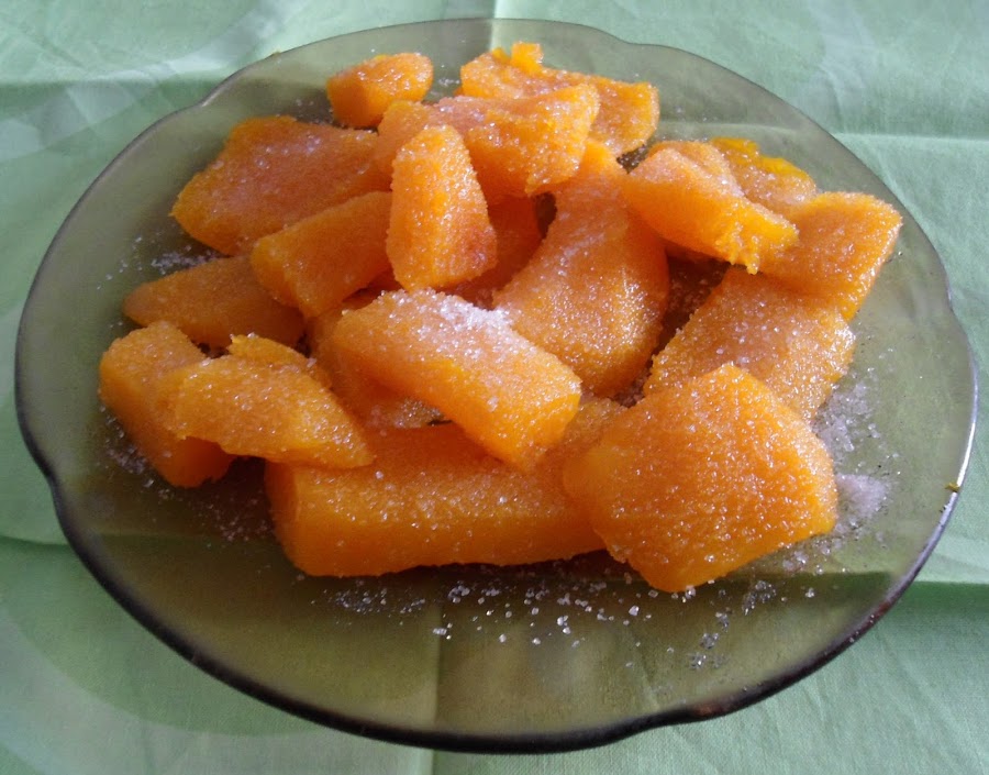 Apartar la cacerola del fuego, sumergir de nuevo la calabaza y dejar enfriar, cuando este fria sacarlosy dejarla secar a temperatura ambiente unas horas y antes de servir echarle azúcar.