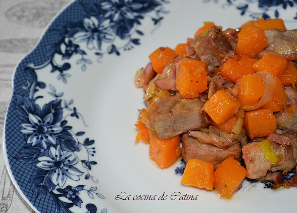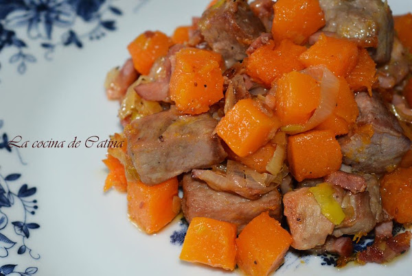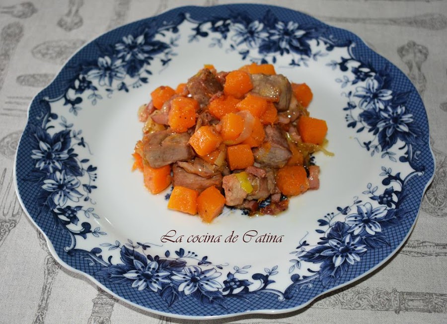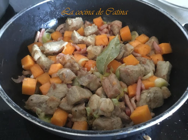 Freímos a fuego lento durante 5 minutos, añadimos la carne que teníamos reservada y dejamos a fuego muy lento hasta que la calabaza esté confitada.