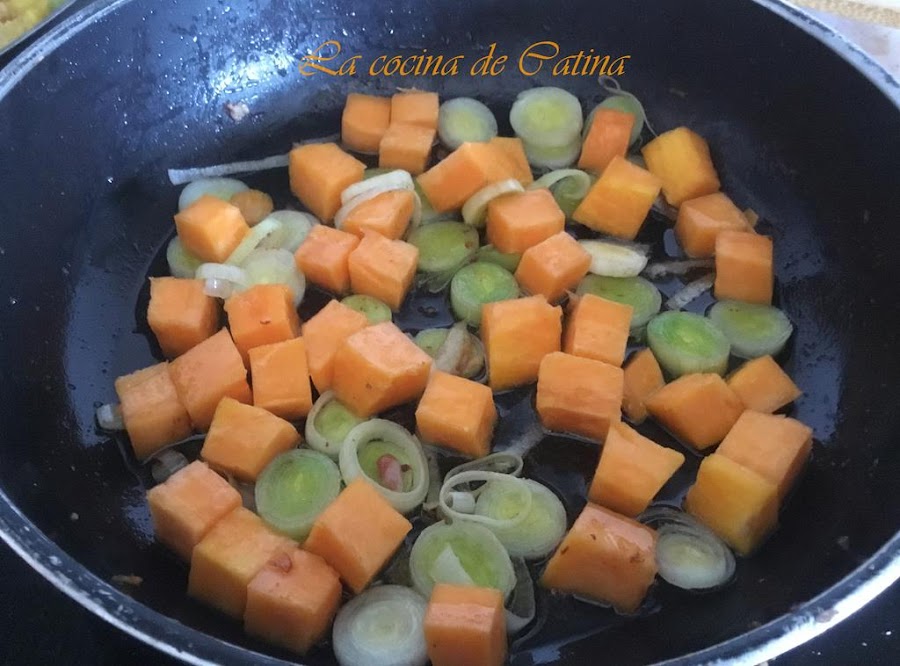 En el mismo aceite, freímos los puerros cortados en rodajas y la calabaza pelada y cortada en dados, la hoja de laurel, sal y pimienta.