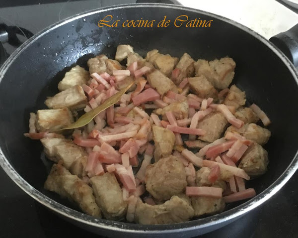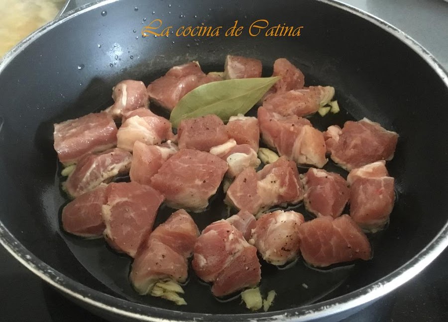 Salpimentamos la carne. Ponemos a calentar una sartén con aceite, cuando esté caliente, echamos los ajos machacados, le damos unas vueltas y a continuación le añadimos la carne y freímos hasta que esté dorada. La sacamos a un plato y la reservamos.
