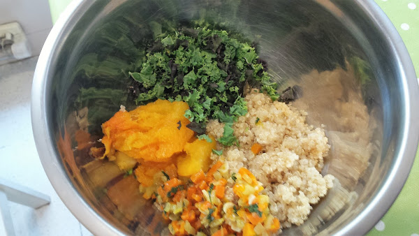 Mezclamos la quinoa picada con las verduritas sofritas, los arándanos secos, las hojas picadas de col kale y un poco del inerior de las calabazas asadas. Sapimentamos y aliñamos con un par de cucharadas de aceite de oliva virgen extra y zumo de limón.