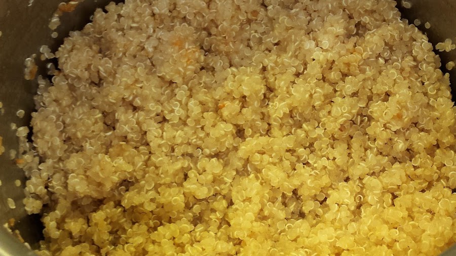Después la ponemos en una cazuela y la cubrimos con el doble de agua. LLevamos la cazuela a fuego medio para hervir la quinoa, tardará unos diez minutos desde que empiece a hervir, verás que se ha absorvido todo el agua y todos los granos de quinoa han explotado, entonces está lista.