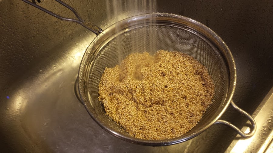Mientras se asa la calabaza preparamos la quinoa, necesitaremos medio vaso de quinoa y el doble de agua para hervirla pero primero hay que lavar la quinoa. La ponemos en un colador bajo el grifo y dejamos correr el agua hasta que salga clara.