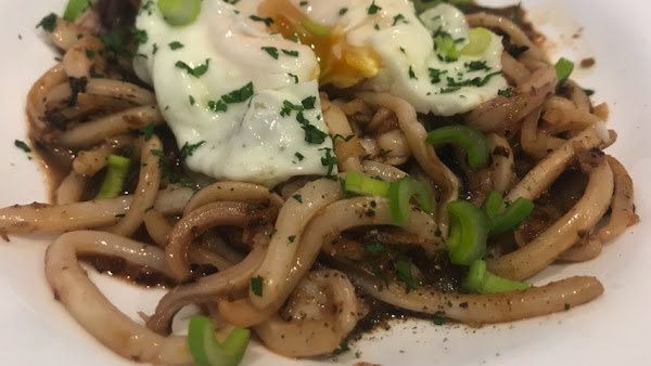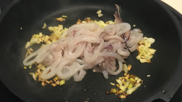 Pon una sartén a fuego alto con unas gotas de aceite de oliva y saltea la cebolleta, el ajo y el calamar en tiras todo a la par y salpimentado a tu gusto.