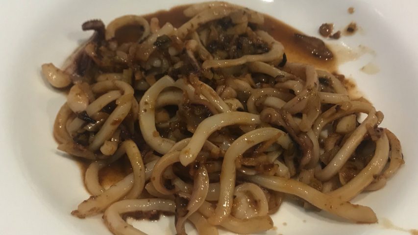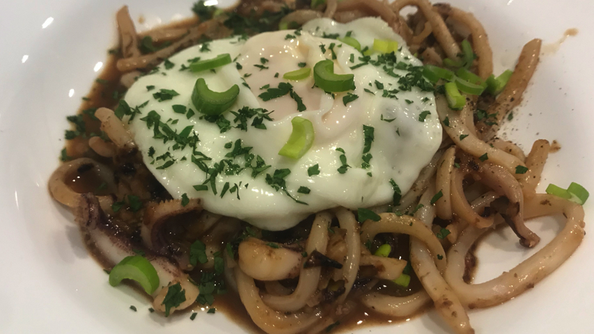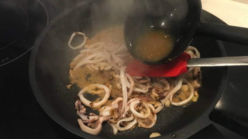 Cuando el calamar empiece a “saltar” añade un poco de caldo que desglosará todo el sabor adherido a la sartén.