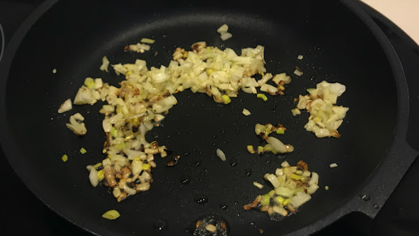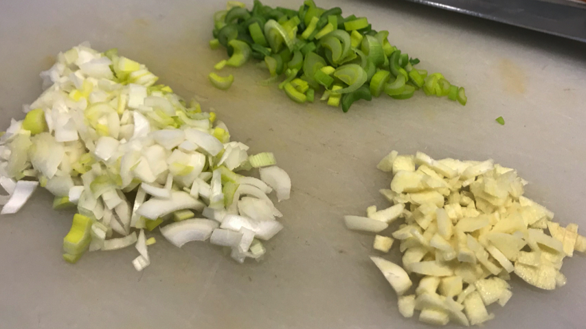 Corta la cebolleta en trocitos pequeños separando la parte blanca de la verde.