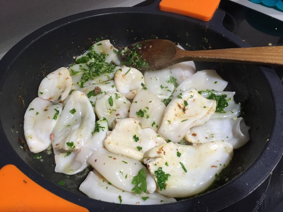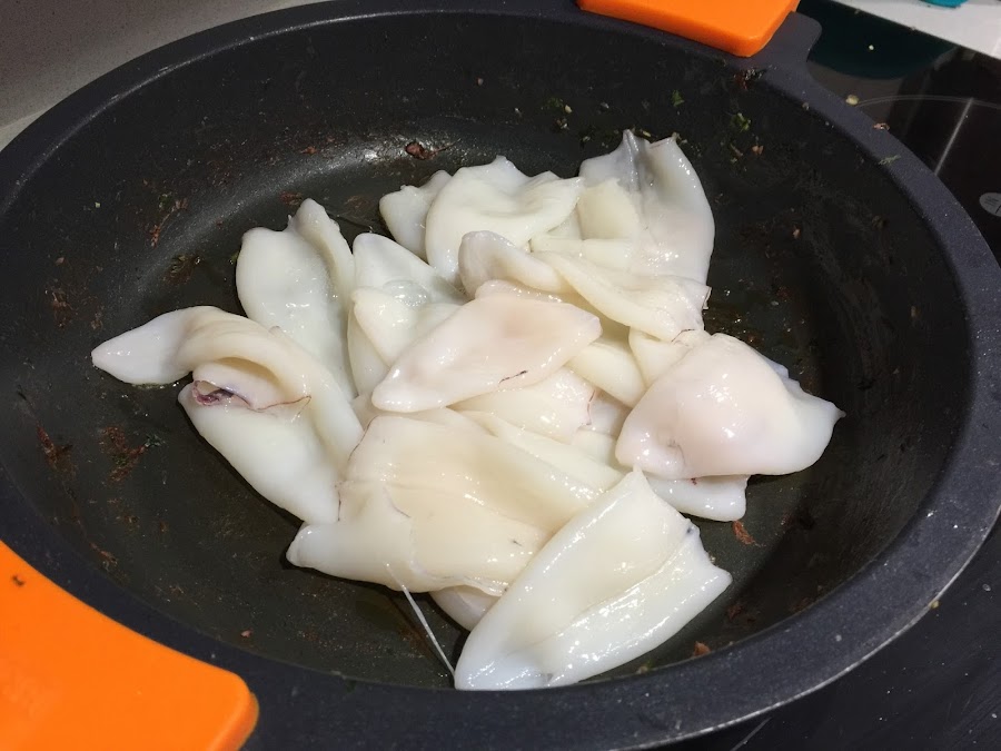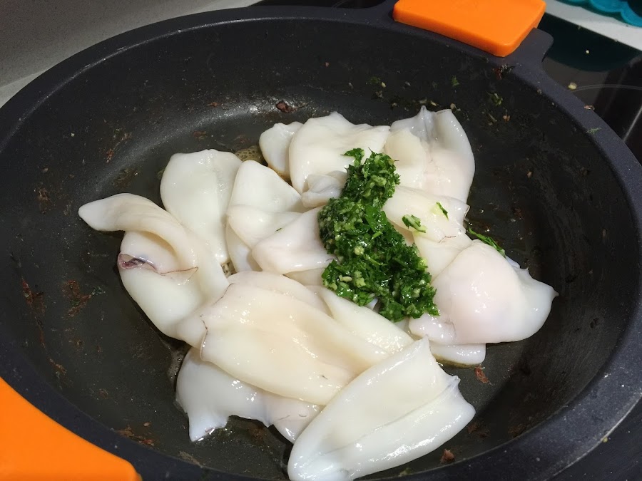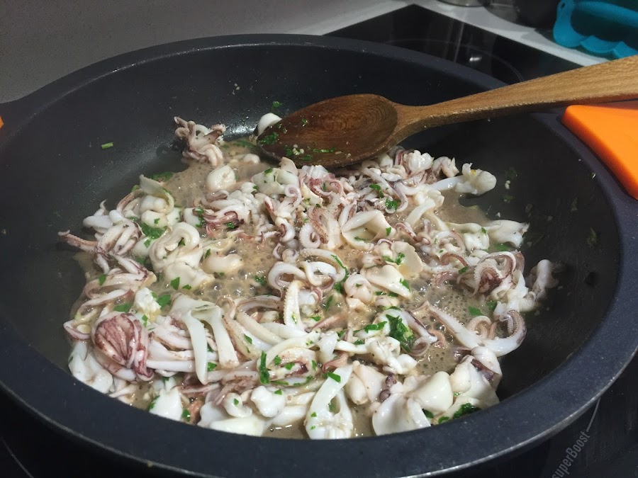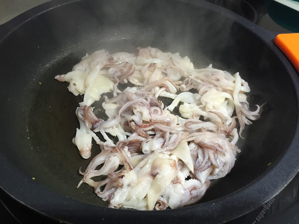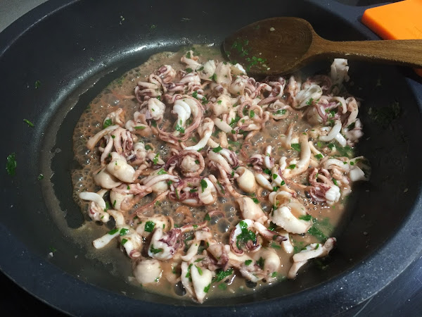 5. A continuación añadimos los calamarcitos de playa. Sofreímos hasta que se hagan por completo, aproximadamente 5 o 6 minutos a fuego alto.
