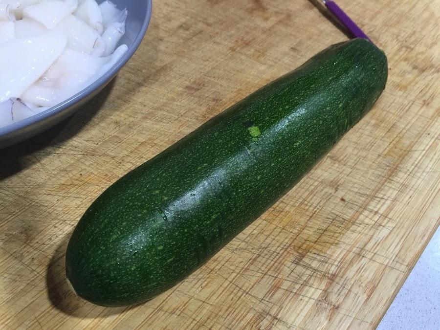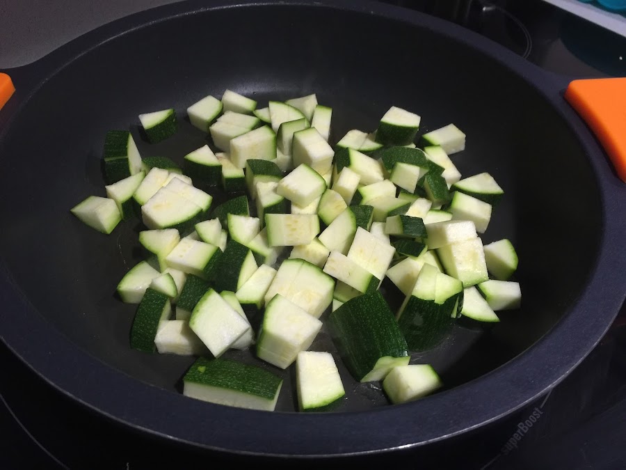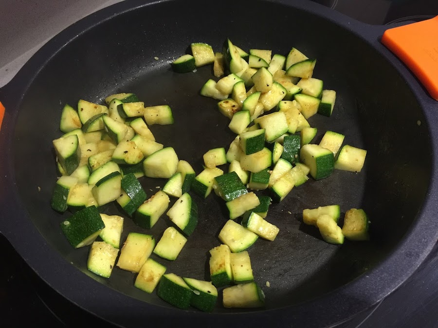 3. Lavamos y cortamos el calabacín a cubitos. Lo sofreímos en la sartén con una gota de aceite hasta que tome un color tostadito. Reservamos.