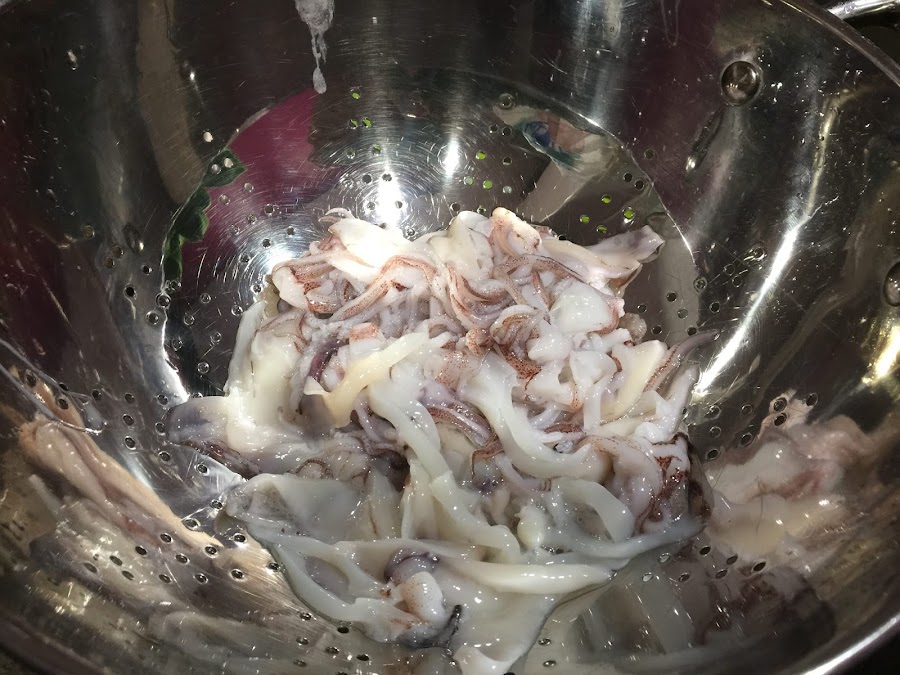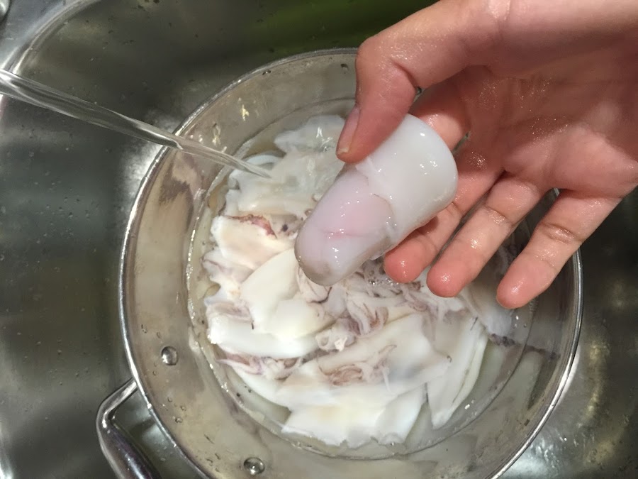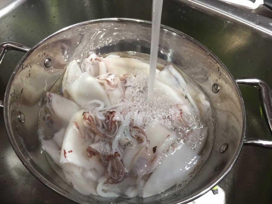 Al llegar a casa los lavamos bien. Para lavar los calamarcitos debemos darles la vuelta, como si de un calcetín se tratase, y limpiarlos bien por dentro con agua corriente.