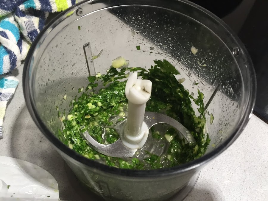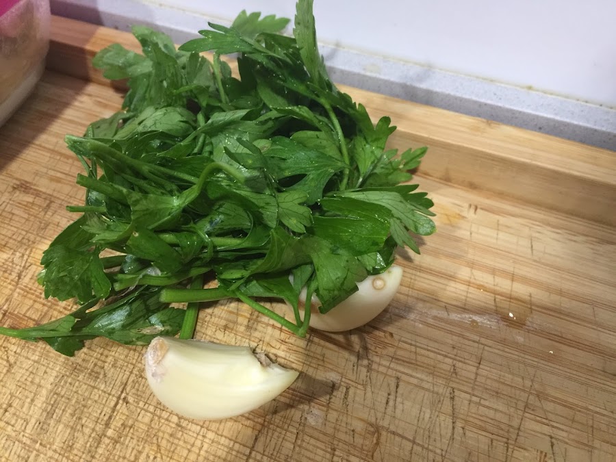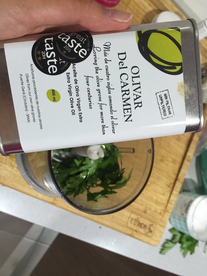 2. Preparamos la picada de ajo y perejil. Pelamos los dos dientes de ajo, lavamos bien el perejil y lo ponemos el vaso batidor. Añadimos poco a poco el aceite de oliva virgen extra de yaentucasa y la sal. Reservamos la picada para más adelante.