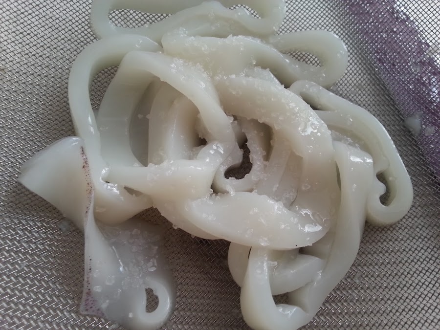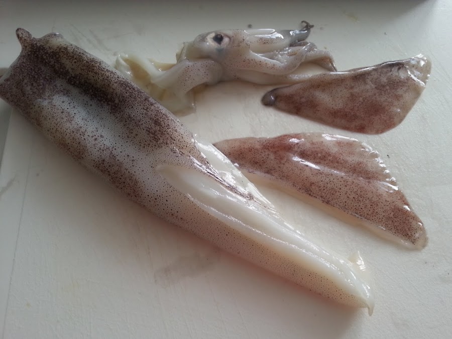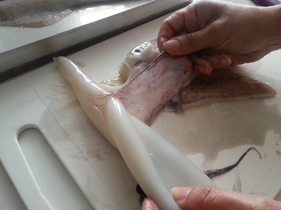 1. - En primer lugar limpiamos el calamar, quitándole las "alas" y las "patas" y lo limpiamos por dentro.