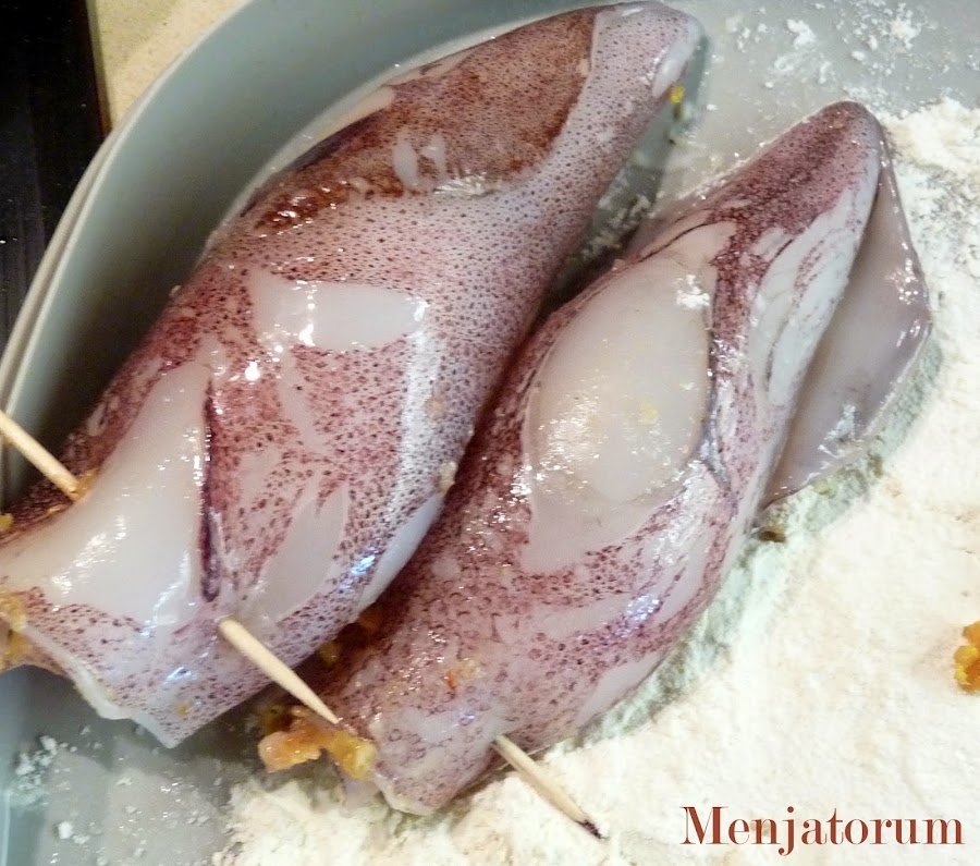 Rellenar con cuidado ,con una cuchara pequeña, con la mezcla unas 3/4 partes de calamar, ya que al cocer encogerán, cerrar con un palillo.