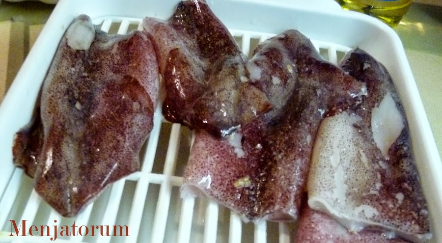 Dejar escurrir los cuerpos de los calamares sobre una rejilla para que suelten toda el agua.