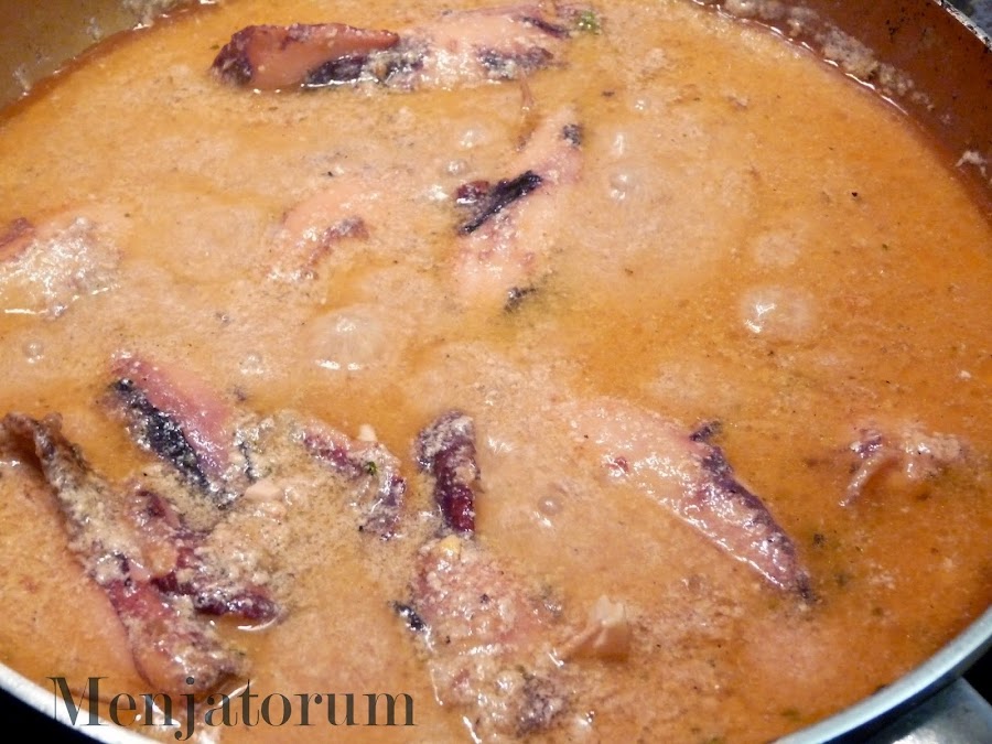 Incorporar la leche a los calamares, cocer a fuego lento durante media hora, cuando empiecen a hervir añadir la picada del mortero.Remover que no se pegue, al ir cociendo los calamares soltarán jugo del relleno que se mezcla con la leche, queda un salsa espesa y riquísima... ya podéis acompañarla de pan, que el plato quedará limpio, seguro!