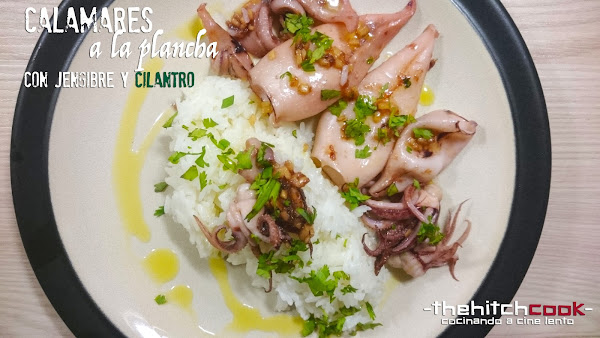 Emplatamos los calamares con el jengibre por encima y espolvoreamos cilantro fresco. Acompañamos con el arroz cocido y terminamos regando con un hilo de buen aceite de oliva Virgen Extra por todo el escenario. ¡Que aproveche, hitchcookian@s!