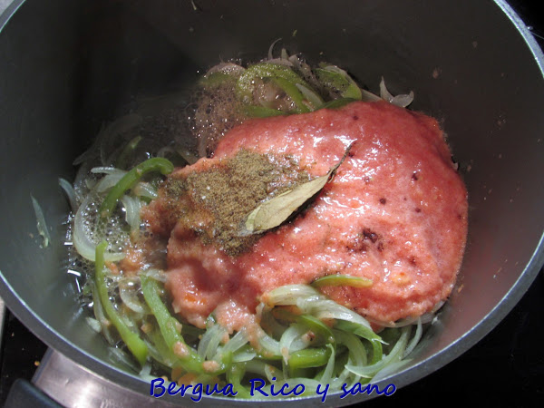 3. Añadimos las especias, el laurel y el tomate rallado o triturado. (Yo prefiero conservar la piel y ahorrar tiempo, así que los trituro sin el pedúnculo) Le damos 15 minutos a fuego medio.
