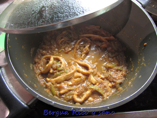 5. Tapamos y cocinamos durante 30 minutos más o hasta que los calamares estén tiernos.