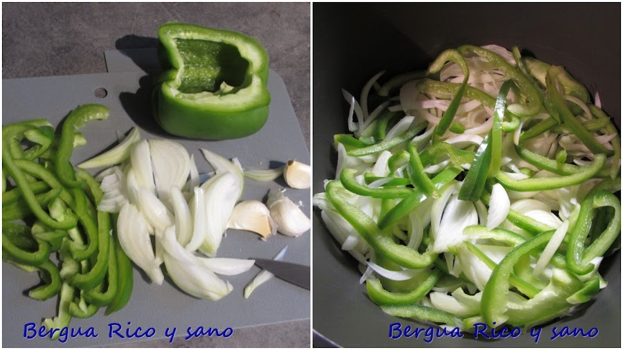 1. Cortamos la cebolla en juliana, el pimiento en tiras finas y el ajo picadito.