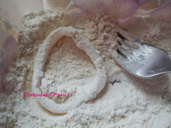 Sacar los calamares de la leche, espolvorear con sal y pasarlos por harina, este proceso es mejor uno a uno. Si lo haces con varios a la vez se te apelmazarán.