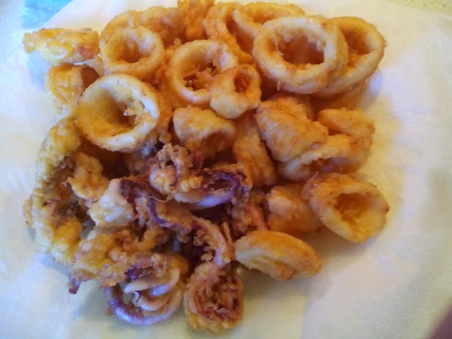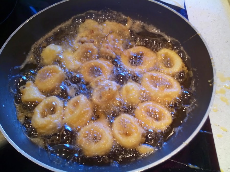 Batiremos 2 huevos, pasaremos los aros de calamares por el huevo de uno en uno echándolos a continuación en una sartén con bastante aceite previamente calentado. Dejarlos que se doren por un lado y después darle la vuelta para que se hagan por el otro.