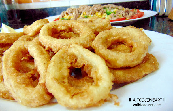 Rodajas de calamar congeladas ( son de buen tamaño y más tiernas que el calamar fresco ). Si quieres utilizar del fresco, puedes meter las rodajas en leche un par de horas antes de utilizar para que queden más tiernas ).
