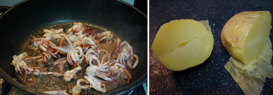 Cuando estén los cuerpos hechos terminamos haciendo las patas, como son más duras se le puede añadir un poco de aceite de la salsa que tenemos. Hacemos unas patatas cocidas o al microondas.