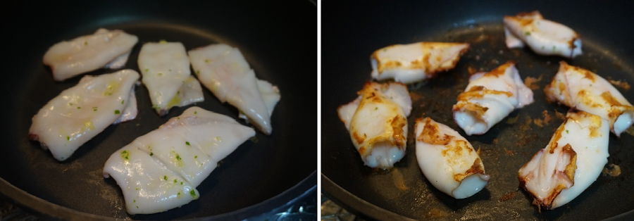 Hacemos unos cortes en los calamares, cuando esté caliente la plancha iremos poniendo los calamares marinados , primero los cuerpos. Dejamos unos minutos por un lado y terminamos por el otro lado.