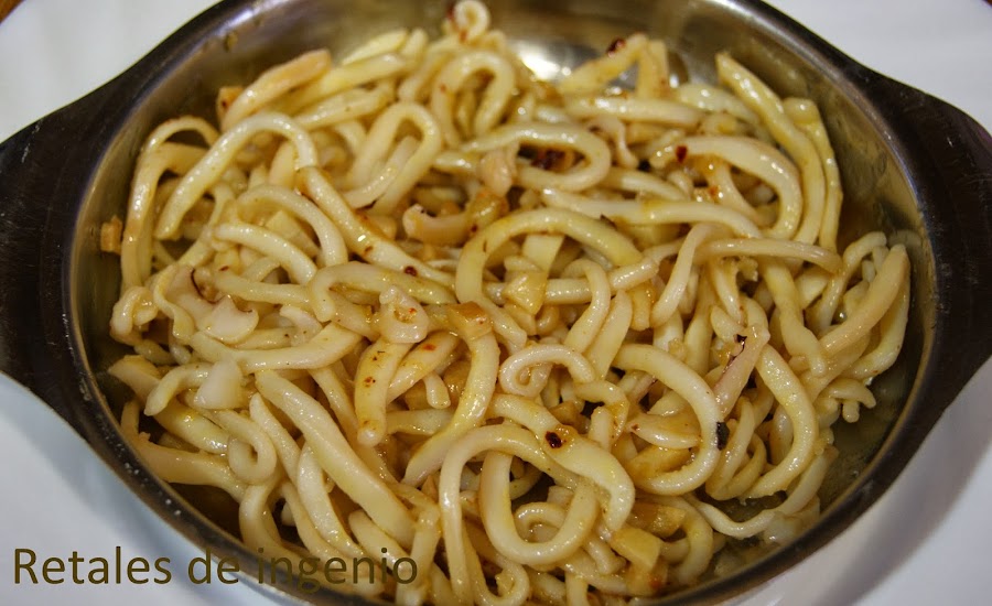 En una sartén, con un poquito de aceite, dorar los ajos a rodajas finas junto con las guindillas y cuando empiece a dorarse el ajo añadís los calamares y los salteáis todo junto hasta que se doren los calamares un poquito.