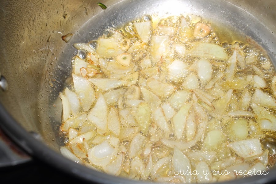 Picamos la cebolla y los ajos muy finitos. En la olla rápida ponemos un poco de aceite y sofreímos la cebolla y el ajo picados.